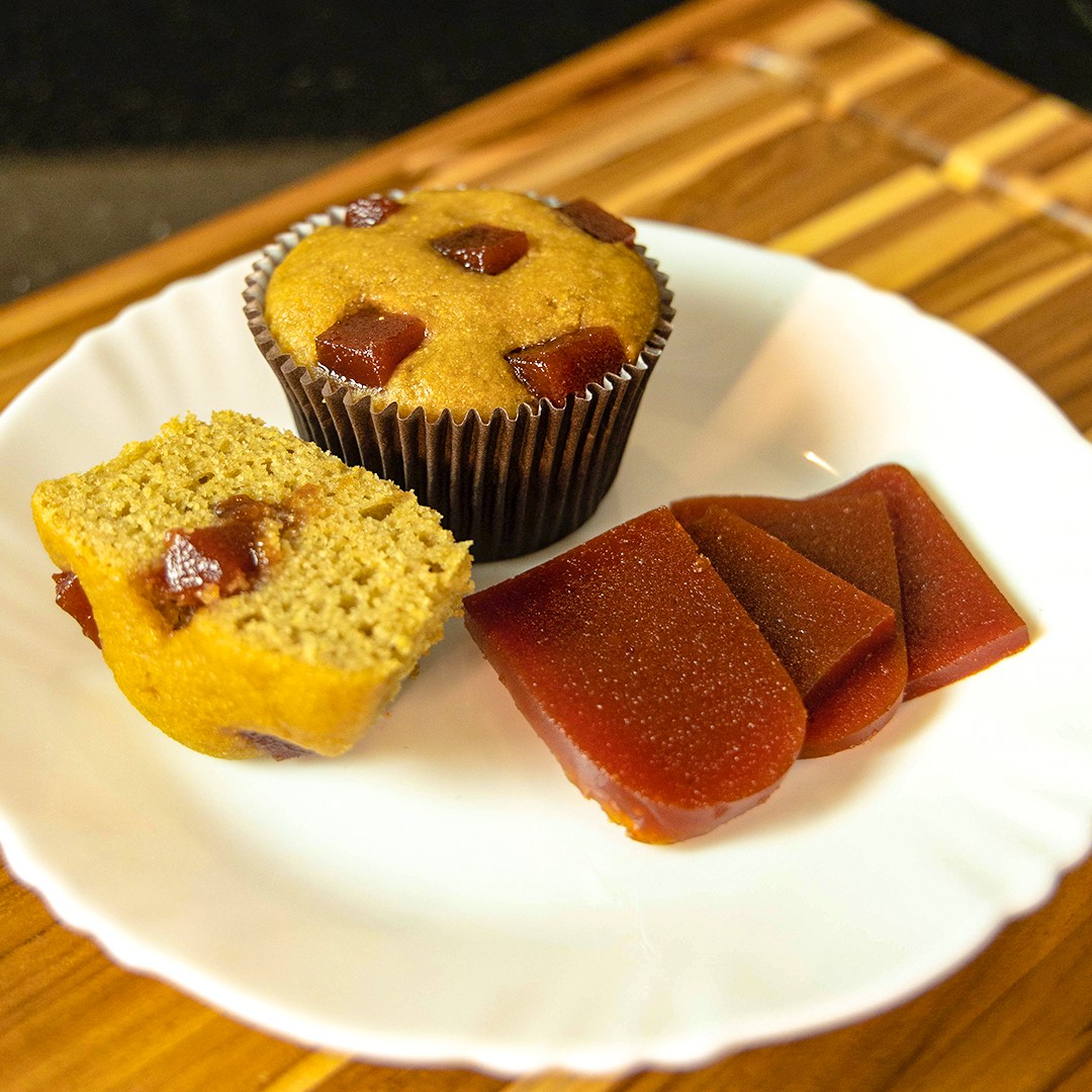 Fuba de milho, farinha de arroz, açúcar mascavo, ovo, leite de coco, goiabada, óleo de soja e fermento.
