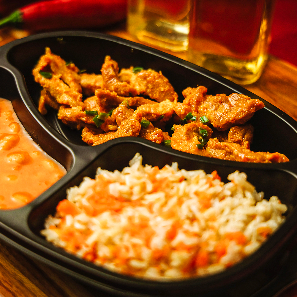 Isca suína grelhada, arroz integral com cenoura ralada e feijão carioca.