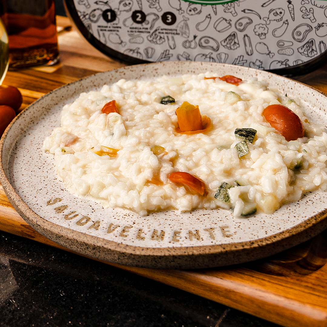 Arroz arbóreo, abobrinha, tomate cereja, vinho branco seco, queijo parmesão ralado e queijo mussarela.